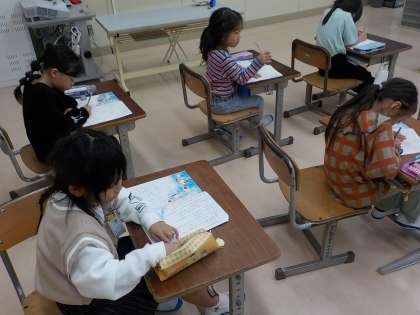 物語文「くじらぐも」の3場面を読み、くじらの気持ちを想像し、教科書に書き込みをしました。