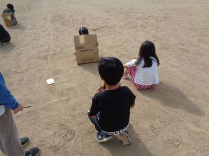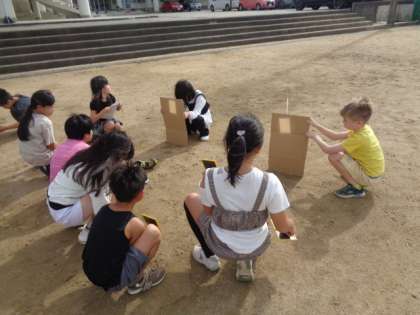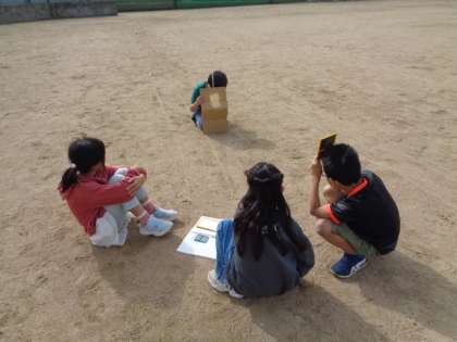 今日はかがみではね返した日光をまとに当てて、温度や明るさを調べました。かがみの数を増やすと様子が変わっていくことに気付きました。グループで役割分担して実験することができました。