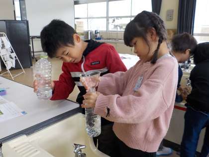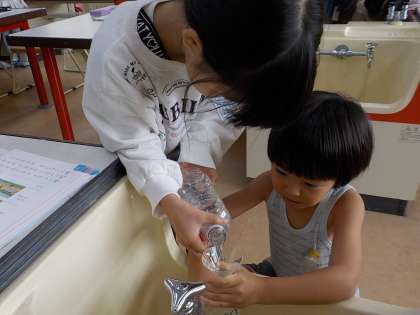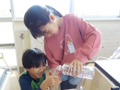 「どちらがおおい」の学習の様子です。ペアの友達とペットボトルに入る水の量を比べました。ペットボトルの高さや太さ、形をヒントに、どちらが多く入るのかを予想しました。そして、片方のペットボトルの水を移し替えて比較しました。楽しく学習を進めています。