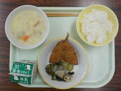 今日の給食メニューは ごはん あじフライ 海藻サラダ クリーム煮 牛乳 です。