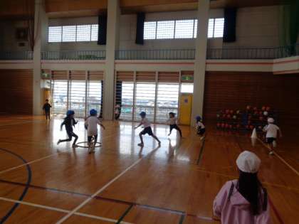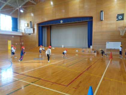 体育では、ハンドベースボールをしました。少しずつルールを加えながら、繰り返し取り組んできました。団ごとに作戦を考え、よりたくさん点が取れるように工夫して活動することができました。