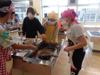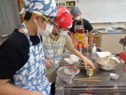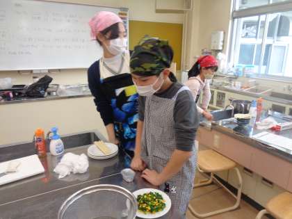 家庭科で「まかせてね、今日の食事」というテーマで、食事を考え調理しました。班ごとに作るものを決めて、手順を確認しながらつくり始めました。