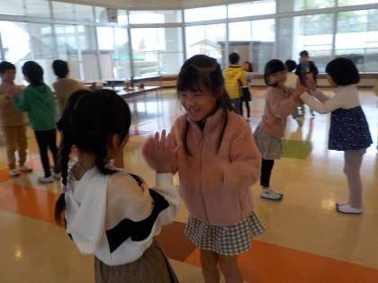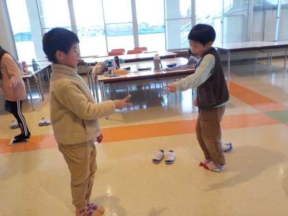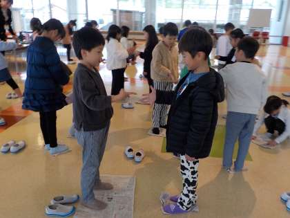 今日は、1・2組が一緒になって活動しました。友達との仲をより深めるために、いつくかのゲームを行いました。バランス崩しと新聞じゃんけんの様子です。たくさんの友達と楽しく関わることができました。