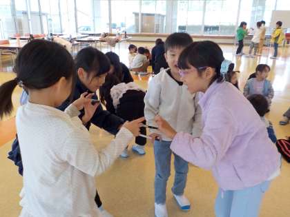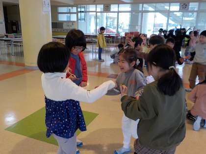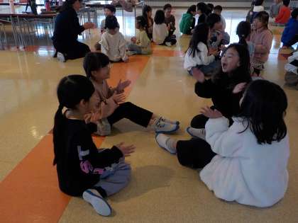 リズムに合わせて名前を呼ぶゲームをしたり、協力してペンを落とさずに持ち上げるゲームをしたりしました。どの活動も、仲良く笑顔で取り組むことができましたね。