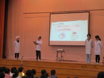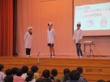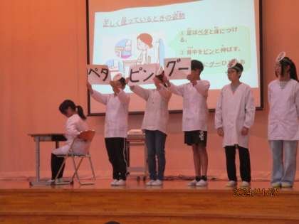 保健委員会の子供たちは練習の成果を発揮し、正しい姿勢について全校に伝えていました。