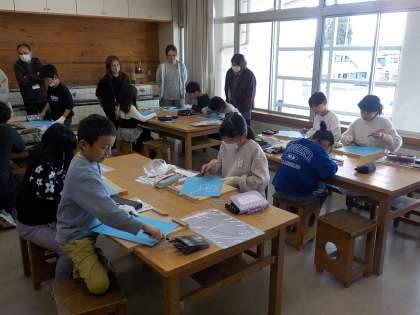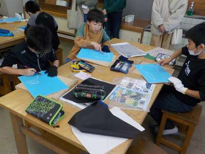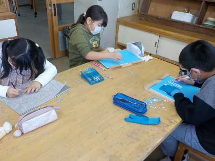 図工科の学習「ほって、すって、見つけて」と題して、彫刻刀で下絵にそって彫り進めました。