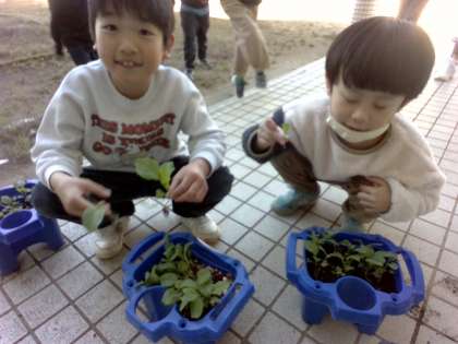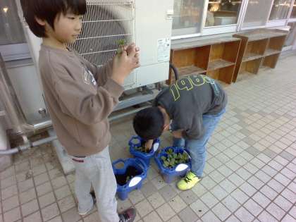 元気そうな芽を3つほど残し、間引いた芽は、夏野菜を育てていた畑に植えました。