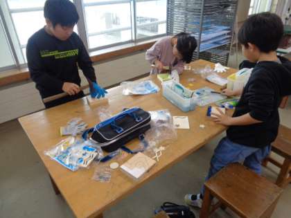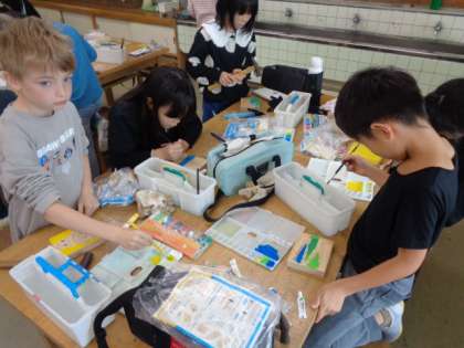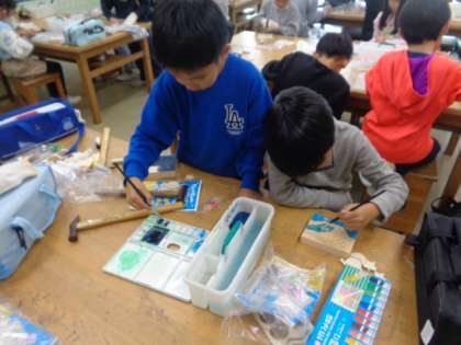 木材に絵をかいて、色を塗って自分らしい作品になるように工夫しています。