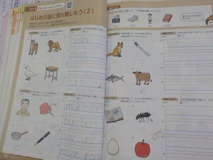 発音に気を付けて英単語を読みました。子供たちはローマ字表記との違いを感じていました。
