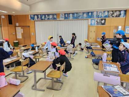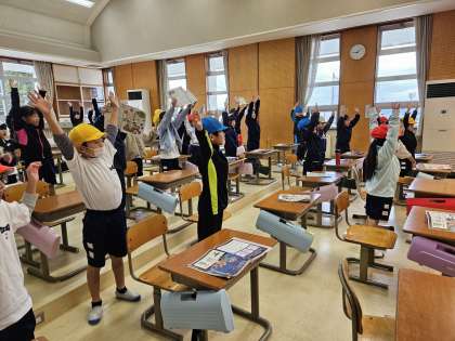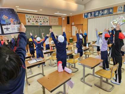 「きらきらぼし」の曲を聞いたり歌ったりしました。また、ドの音で体育座りをしたり、ラの音でバンザイをしたりして、音の高さを体で表現しました。音の高さに合わせて、元気に体を動かした子どもたちです。