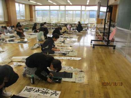 書き初めの練習をしている様子です。今年は「水清き里」です。