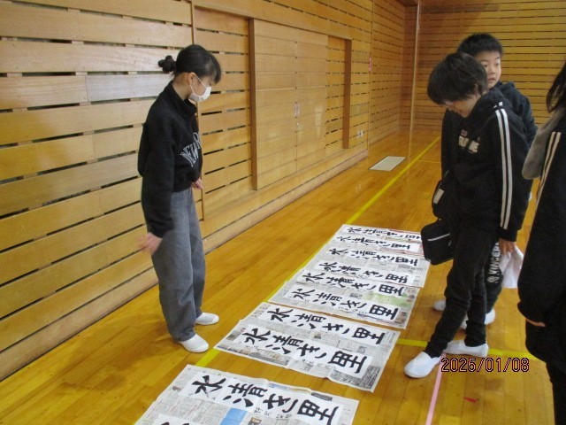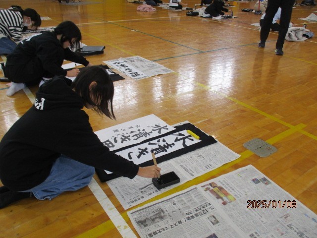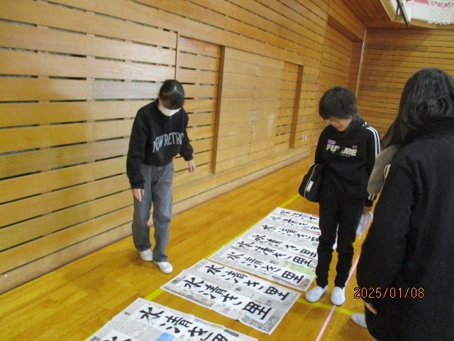 静かな体育館で真剣に書いています。書き終わった後は後片付けをし、友達の書いた作品を見ていました。
