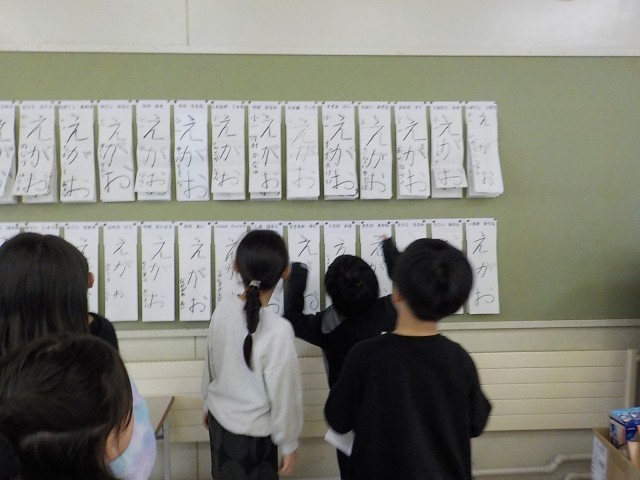 3学期がスタートし、書き初め大会に臨んだ子供たち。冬休み中にたくさん練習したことが伝わりました。どの子供も、力強く、のびのびと「えがお」と書いていました。