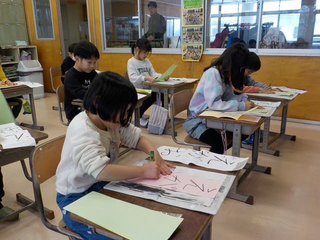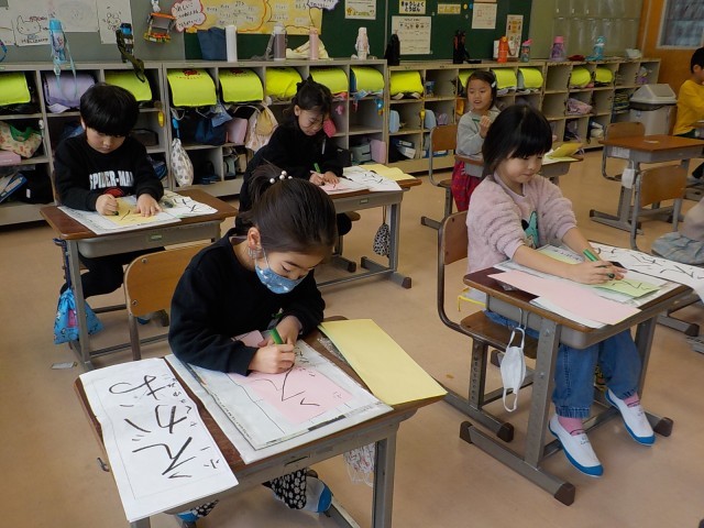 3学期がスタートし、書き初め大会に臨んだ子供たち。冬休み中にたくさん練習したことが伝わりました。どの子供も、力強く、のびのびと「えがお」と書いていました。