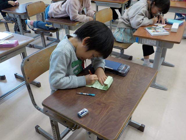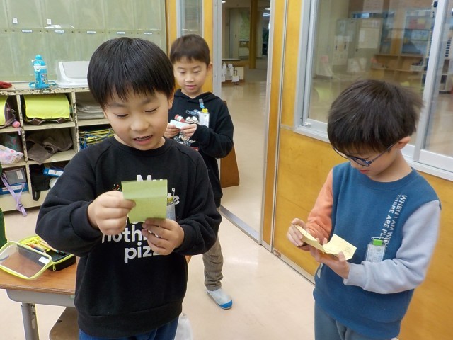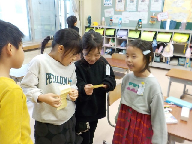 学活の様子です。にこにこおみくじを作り、みんなで引きました。みんなが笑顔になれる内容を考え、おみくじを作りました。その後は、願いを込めて上に投げ、友達の作ったおみくじを引きました。この一年、素敵な年になりますように・・・。