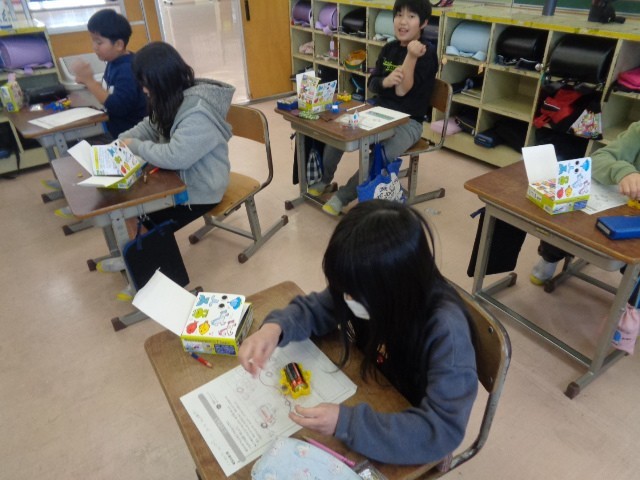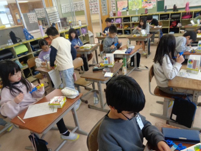 理科では、明かりがつく仕組みについて考えました。いろいろなつなぎ方を試して、明かりがつく条件に気付いていました。実験道具を友達と教え合いながら、使いこなすことができました。