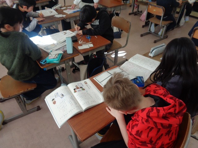 国語では、学習したことをいかして音訓かるたをつくりました。ペアで相談しながらリズム感のある文章になるようにくふうしていました。いろいろな漢字の音読みと訓読みを確認することができました。