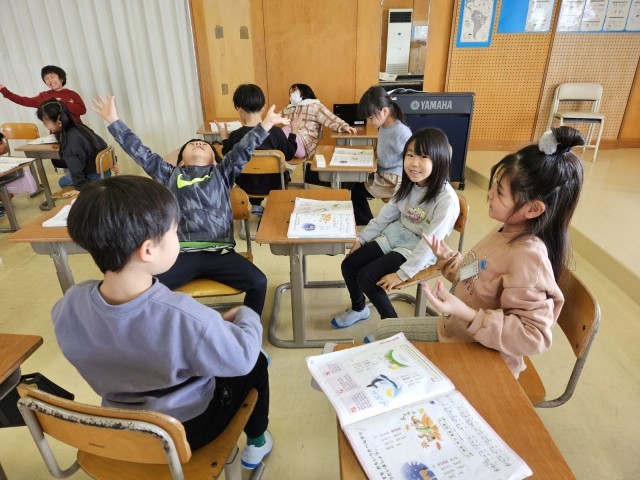 音楽の様子です。「はる・なつ・あき・ふゆ」の曲に合わせ、様子を思い浮かべながら歌ったり、体で表現したりしました。グループで動きを相談し、みんなの前で発表しました。それぞれの季節の様子にあった歌い方や動き方ができましたね。