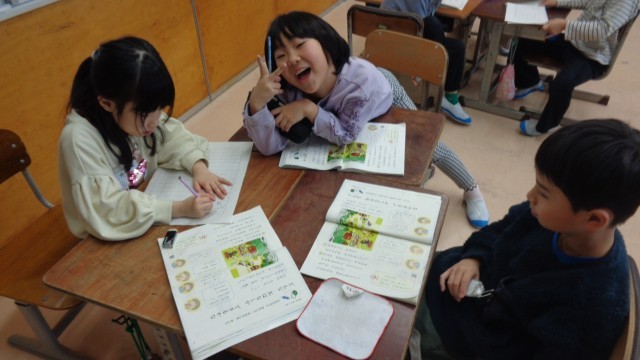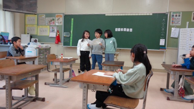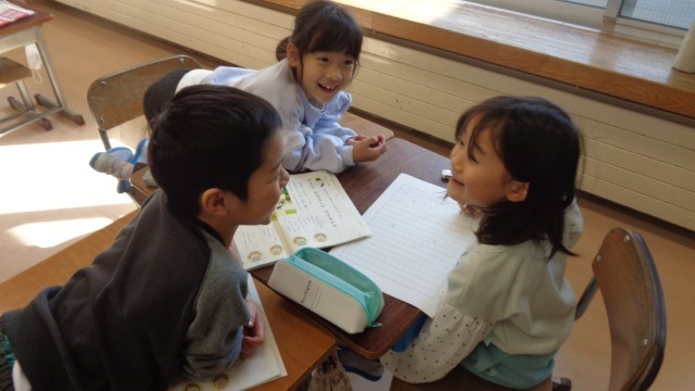 今日の国語科の学習は、自分たちでお話を考えました。教科書にある挿絵から想像が広がり、楽しい物語がたくさん思い浮かんでいる様子が見られました。他の班の物語を聴く子ども達も、とても楽しそうでした。