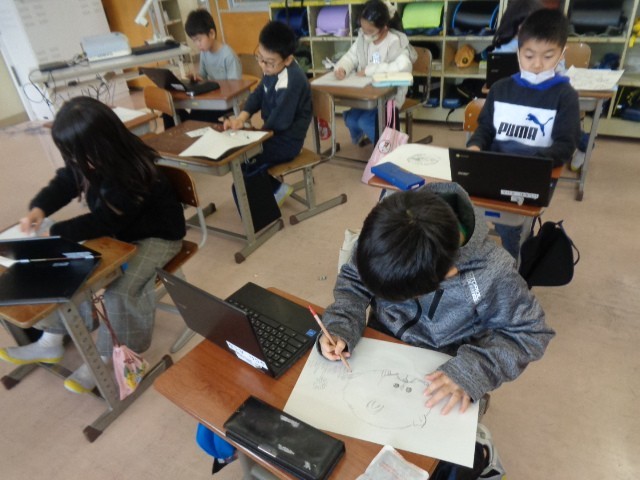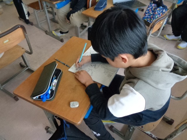 図画工作科の学習では、版画に取り組みます。今日は板に絵をうつす活動を行いました。彫りやすいように、大きく濃くかくことを心がけました。次は初めて彫刻刀を使います。安全に気をつけて、集中して取り組みましょう。