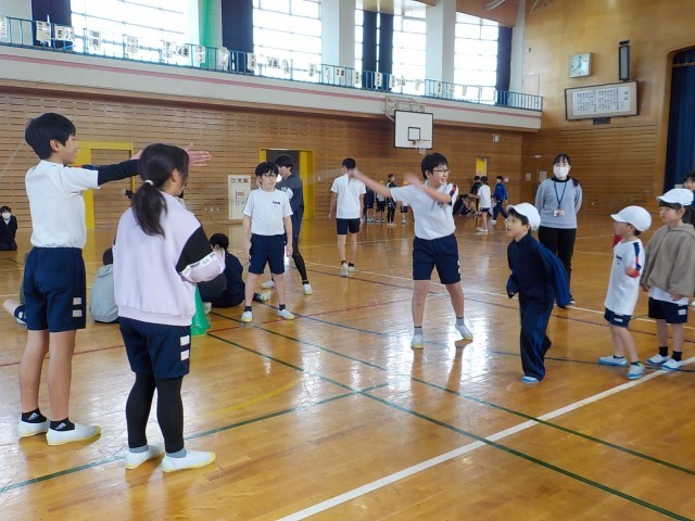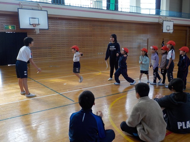なわとび大会に向けて練習をする1年生。今日は、6年生の力を借りて一緒に練習をしたり、教えてもらったりしました。さすがは6年生で、縄に入るタイミングや、跳ぶ位置、通り抜ける場所を丁寧に教えてくれました。教えてもらったことを生かして跳ぶと、前回よりも回数が大幅にアップしました。この後も練習を続けて、本番はベストの記録が出せるように頑張りましょう。