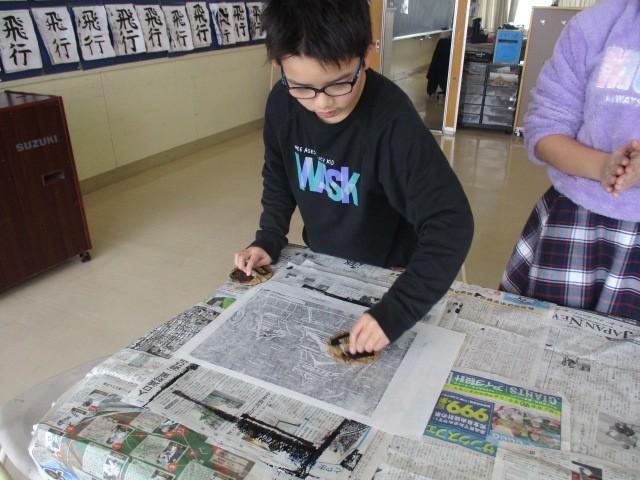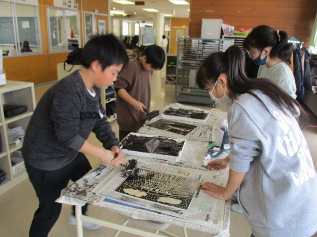 刷り終わった子が他の子にやり方を教えています。次回は色づけをします。楽しみですね。