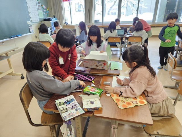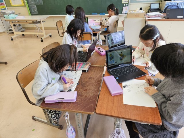 係活動の様子です。3学期の終わりに、学年集会を企画しています。1組は「お祭り」をテーマに集会を考えています。みんなで踊れるダンスを考えたり、お祭りの雰囲気に合うイラストを描いたりしています。本番が楽しみですね。