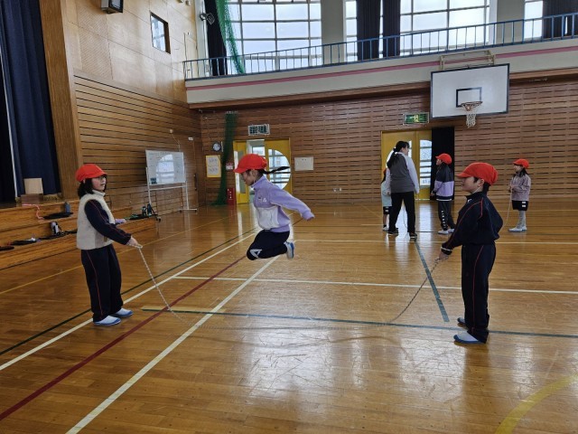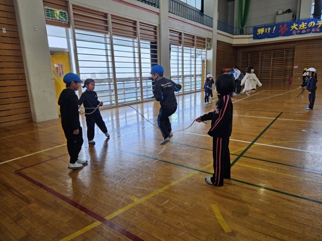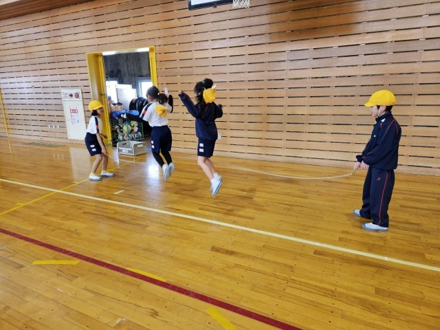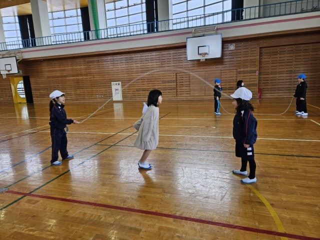 縄跳びの学習をしています。今日は音楽で学習した「おおなみ こなみ」をやってみました。初めてやってみる子もいましたが、何度もチャレンジしていました。成功すると、とても嬉しそうにしていました。いろいろな跳び方をやってみたいですね。