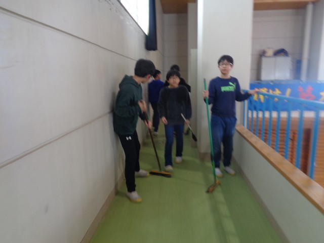 総合では、いくつかの班に分かれて卒業プロジェクトの計画・実行をしています。この班は、学校をきれいにしよう隊です。先生方にアンケートをとり、学校のどこをきれいにしたらよいかを調査しています。今回は、校長先生のリクエスト「体育館ギャラリーの掃除」です。床や窓など、自分たちで掃除の仕方を考えきれいにしていました。