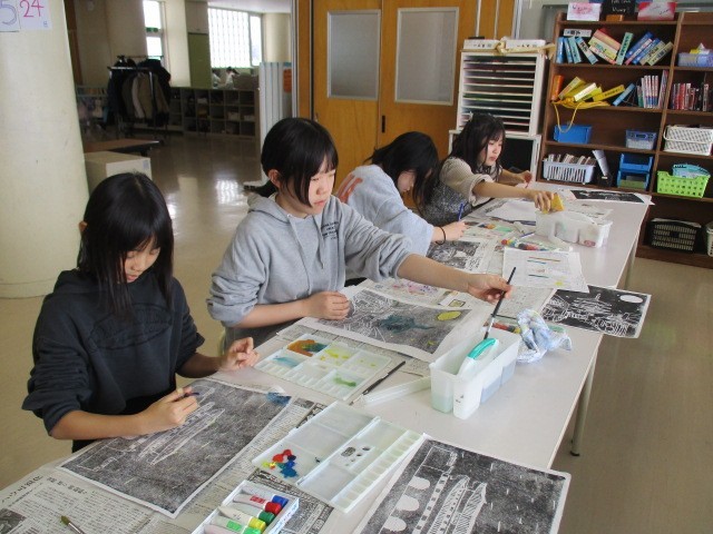 版画の仕上げ作業に入っています。丁寧に色づけをしています。