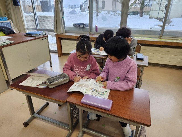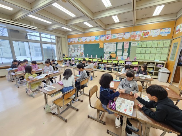 「どちらがひろい」の学習の様子です。広さはどうしたら比べられるのかを学習したあと、陣取りゲームをしました。塗ったマス目を数えてどちらが広いのかを確かめていました。楽しく学習を進める子どもたちです。