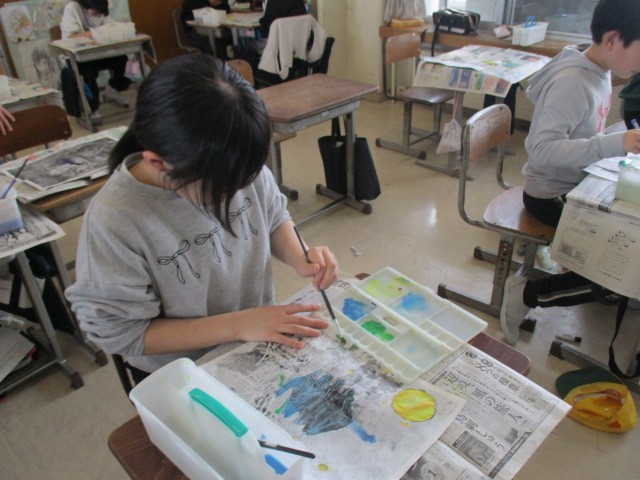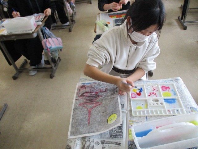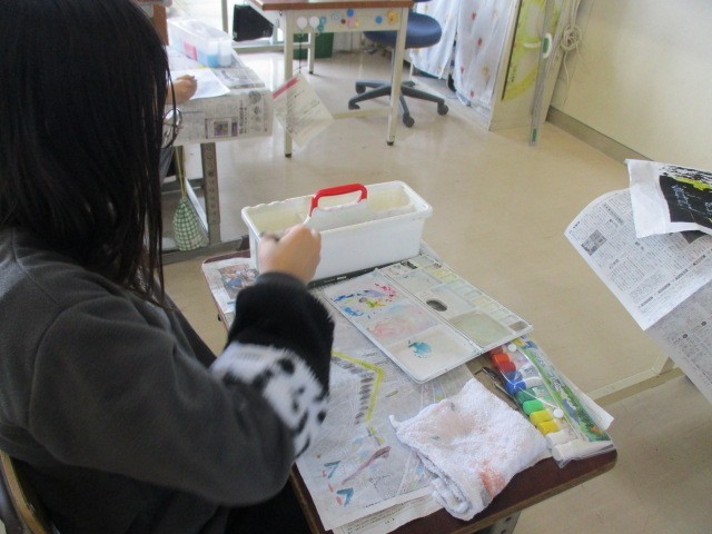 色塗りをしている様子です。和紙の裏から色を塗ると、表にじんわりと色が出てきます。