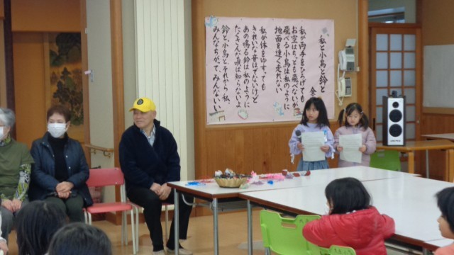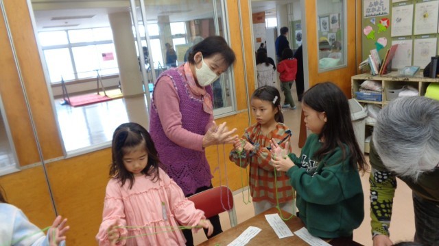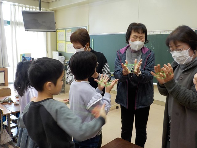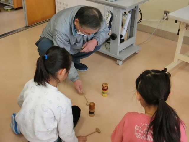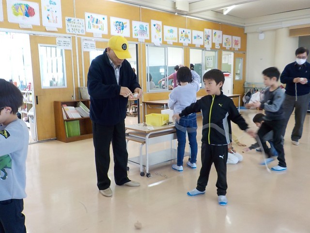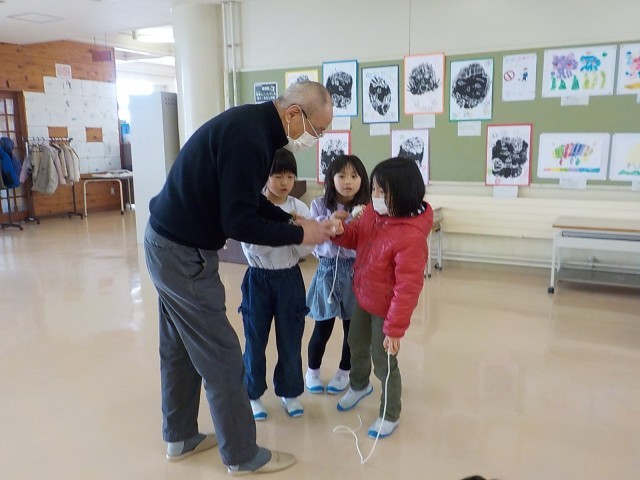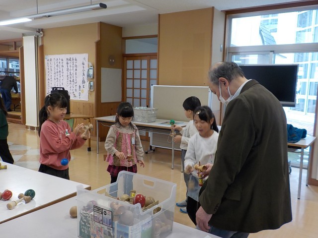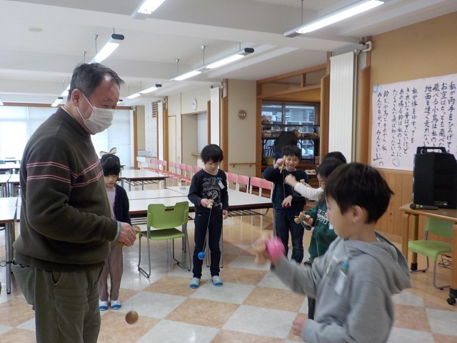 大寿会のみなさんに、昔の遊びを教えていただきました。こま、けん玉、だるま落とし、あやとり、お手玉を教えてもらいました。できなかったことができるようになったり、より上手になったりして、とても嬉しそうでした。優しく教えていただき、楽しい時間になりました。大寿会のみなさん、ありがとうございました。