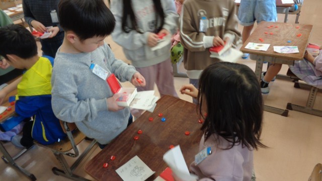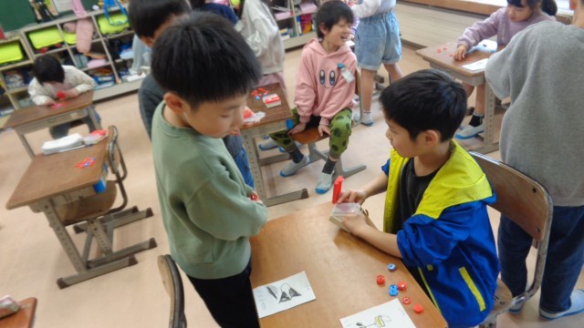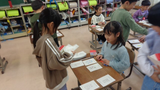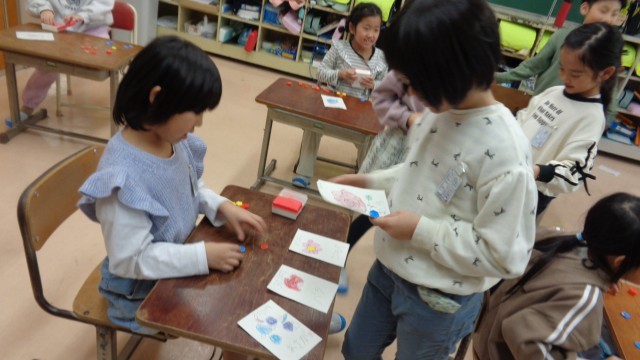 今日は国語の授業で「おみせやさんごっこ」をしました。「がっきやさん」「くだものやさん」など、みんなそれぞれ好きなお店の商品の絵を描いたり、値段を決めたりしました。子供たちはとても楽しそうに取り組んでいました。
