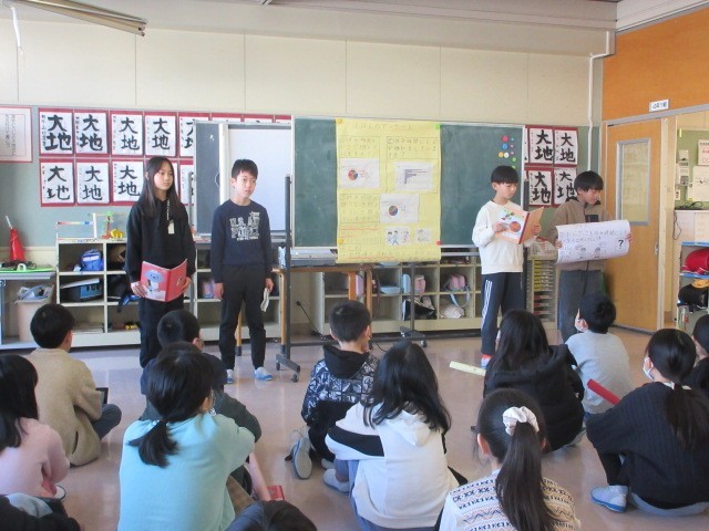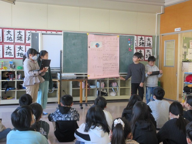 国語科では、自分たちの生活について調べたことを発表しました。子供たちは、食生活や睡眠、メディアの時間等、日々の生活から生まれた疑問についてアンケートをとって調べたり、まとめたりしました。どの班も、声の大きさや速さに気を付けたり、資料を見やすくまとめたりするなどの工夫を凝らしており、調べたことがよくわかる発表になっていました。