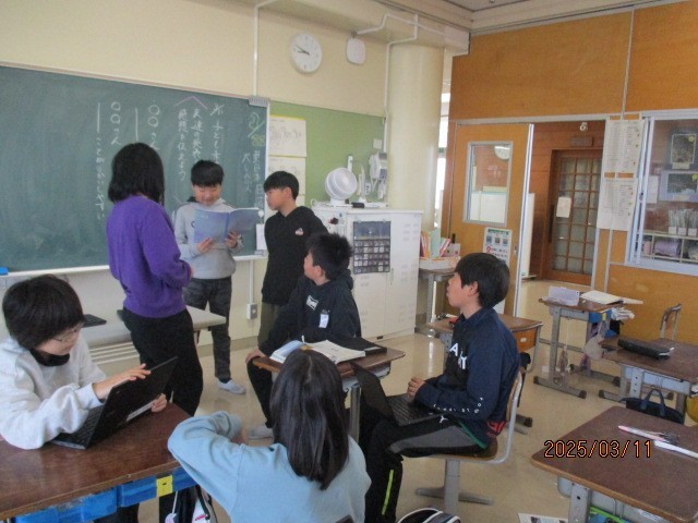 国語科「子ども未来科」の学習では、自分が決めたテーマに沿って感想を伝えたり提案をしたりします。