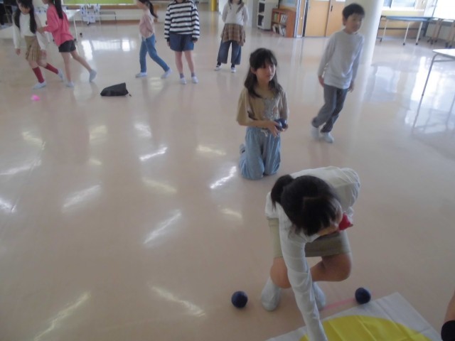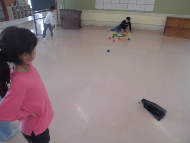 休み時間に「ボッチャ」に挑戦しました。子供たちは、力加減や玉を投げる方向を意識しながら、友達と楽しみました。