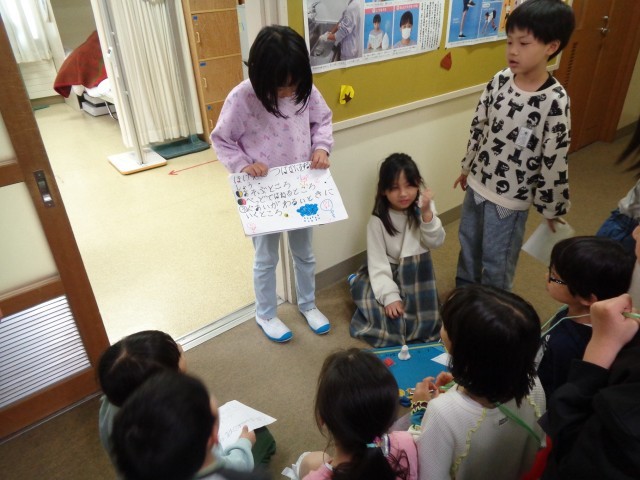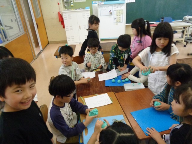 保健室、職員室、音楽室、給食室に関するクイズを出したり、粘土で給食のメニューをつくって紹介したりしました。