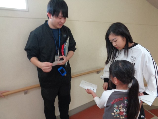 生活科の学習で、友達と交換した自己紹介カードを、今度は先生方に渡しました。初めて話す先生や、初めて入る教室で緊張しながらも、自分の名前や好きなものを伝えることができました。