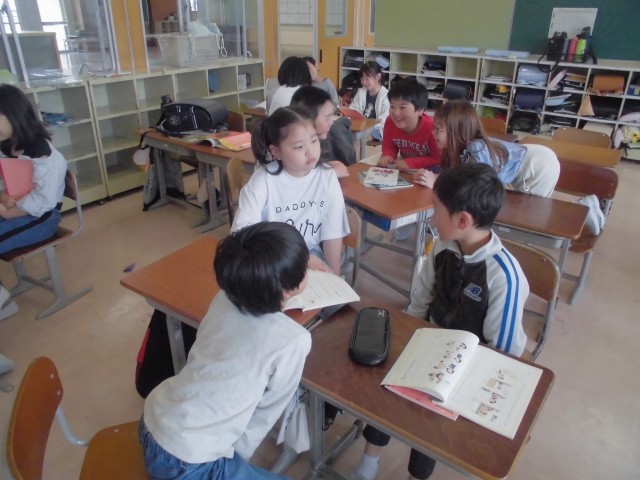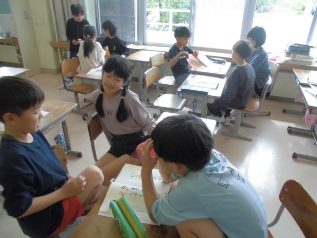 国語科で、友達にインタビューをする学習をしました。いつ、どこで、だれが、どうして等の言葉を使ってインタビューし、友達の好きなことを詳しく聞きました。