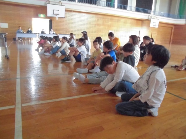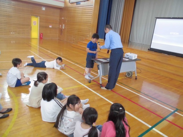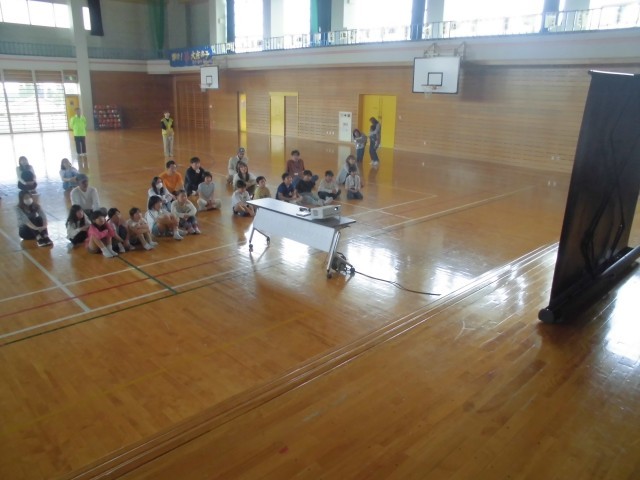 天候不良のため、グラウンドでの実地訓練は行えませんでしたが、体育館で自転車に乗った際の交通安全の注意点について、DVDを視聴し、警察官の方のお話を聞きました。