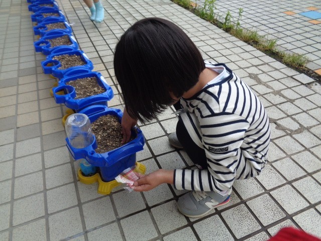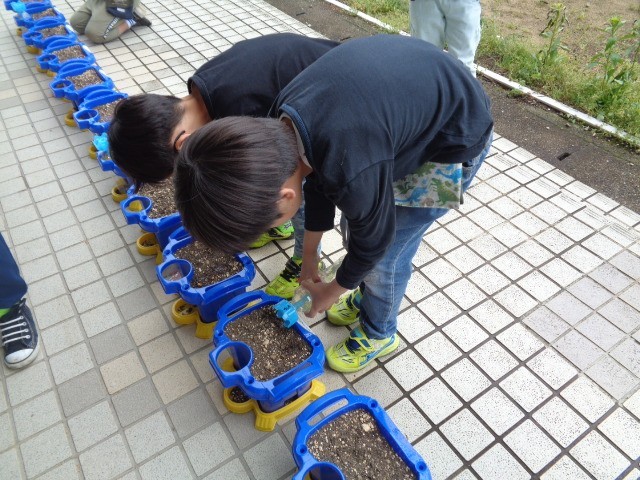 生活科であさがおの種を観察しました。お気に入りの種を見付けて、色や形に注目して観察しました。観察したあと、種を植えました。元気に育つように心を込めて植えました。これからの水やりも頑張ります。