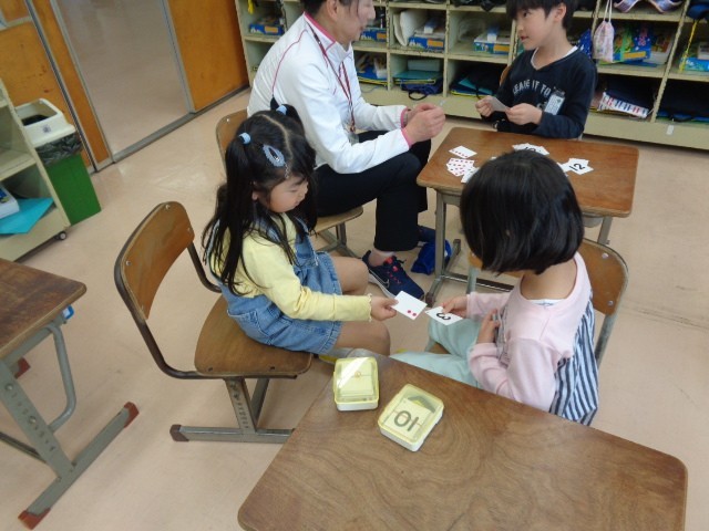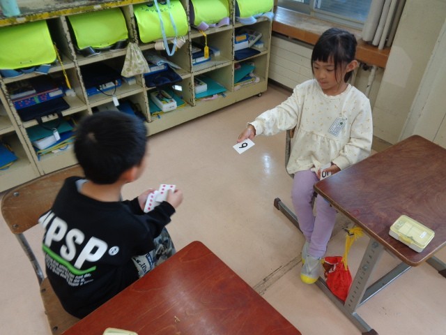 算数科では、数カードを使って数を比べました。どちらが大きいか勝負しました。楽しく数を比べることができました。