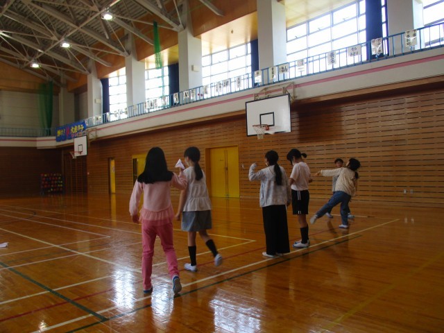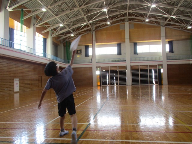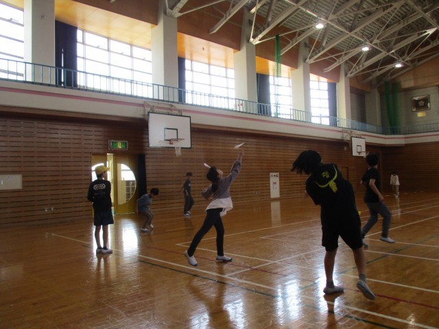 係が企画し、クラスで紙飛行機大会を行いました。一人一つ、紙飛行機を作って、距離を競いました。最高で20m近く飛んでいました。