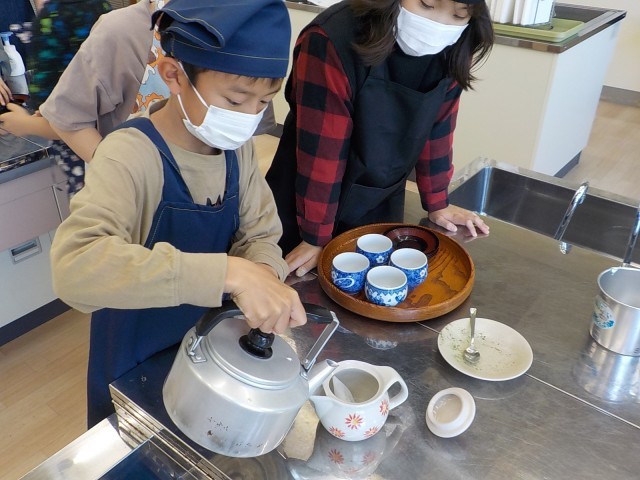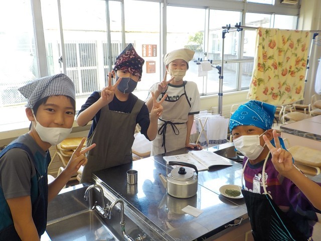 家庭科では、初めて調理実習を行い、お茶をいれました。茶葉や水の量を丁寧に量ったり、次の工程を友達同士で話し合ったりするなど、集中しながら楽しんで実習に取り組む姿が見られました。おいしいお茶をいれられてよかったですね。