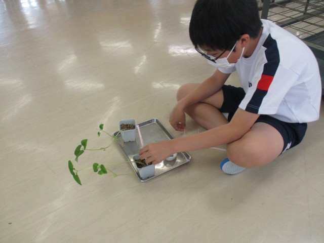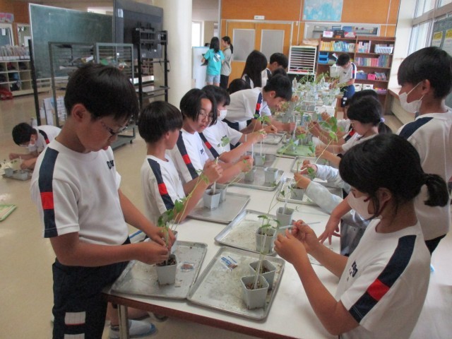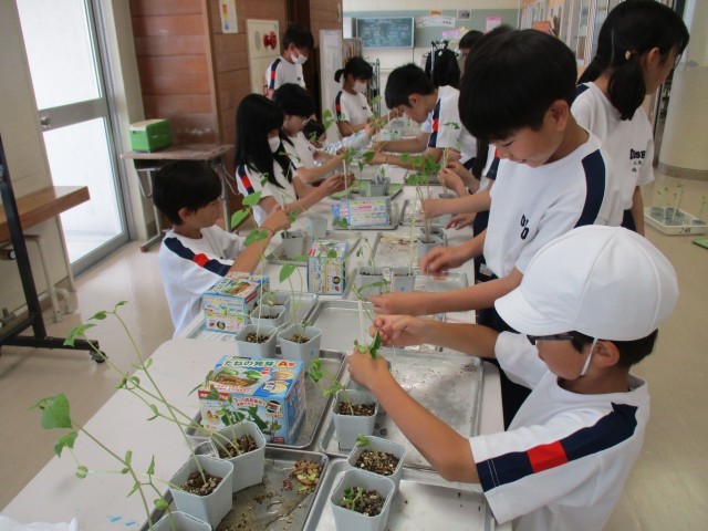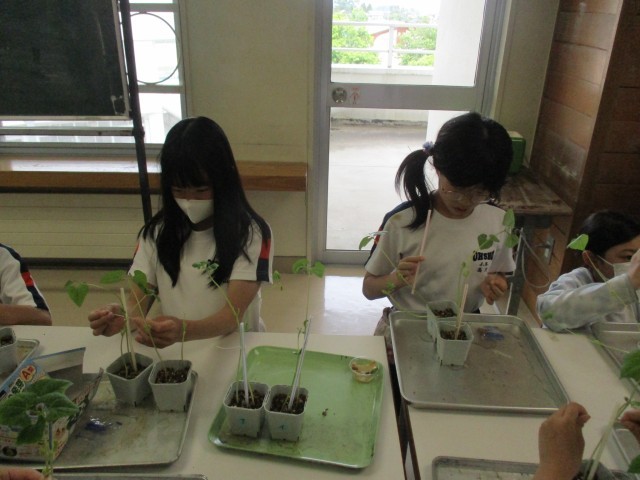 調べ学習と実験で使っている豆に支柱をつけました。大きくなってきたので、倒れないように支柱に結びつけます。