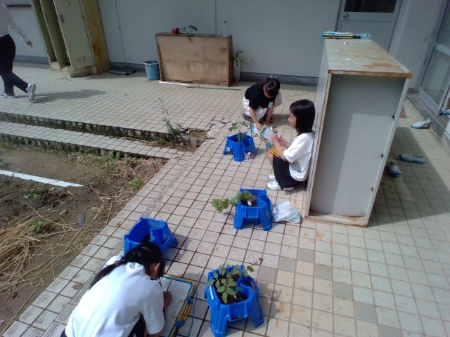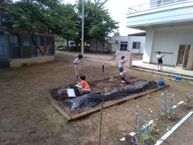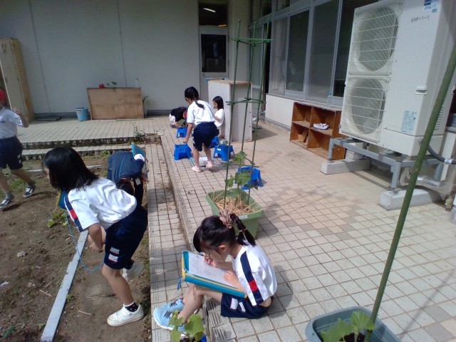 教科書で「かんさつ名人」になるためのポイントを学習したあと、実際に畑に出て、野菜の観察をしました。
