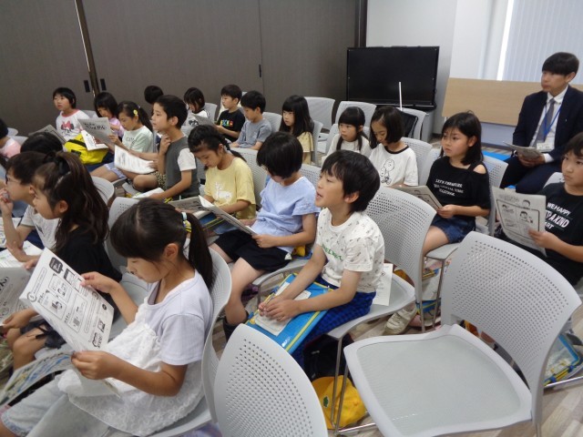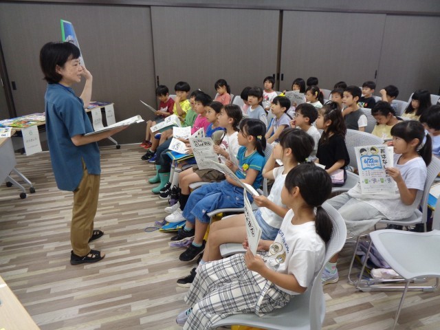 富山市立図書館の数や場所についてのお話や、本のラベルの意味について教えていただきました。