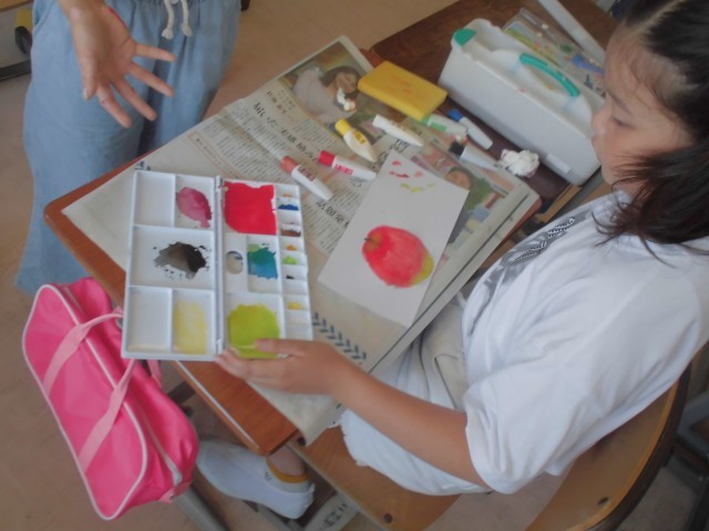 水彩のよさや描き方を学習しました。水彩の濃淡を意識したり、混色や重ね塗りをしたりすることで表現力を高めました。子供たちは、集中してリンゴの絵を描きました。