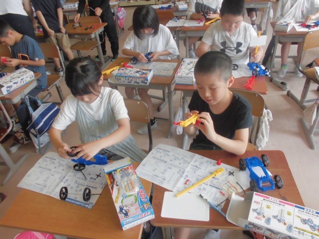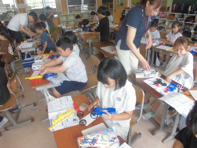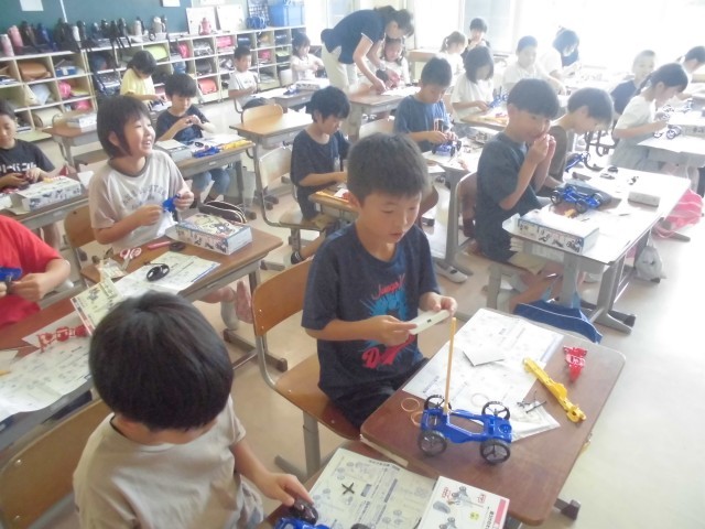 理科の3年生の風やゴムの学習の実験キットをつくりました。子供たちは、説明書を見たり友達と助け合ったりしながら実験キットを完成させました。できたものに風を送り、早速風の力を確かめていました。